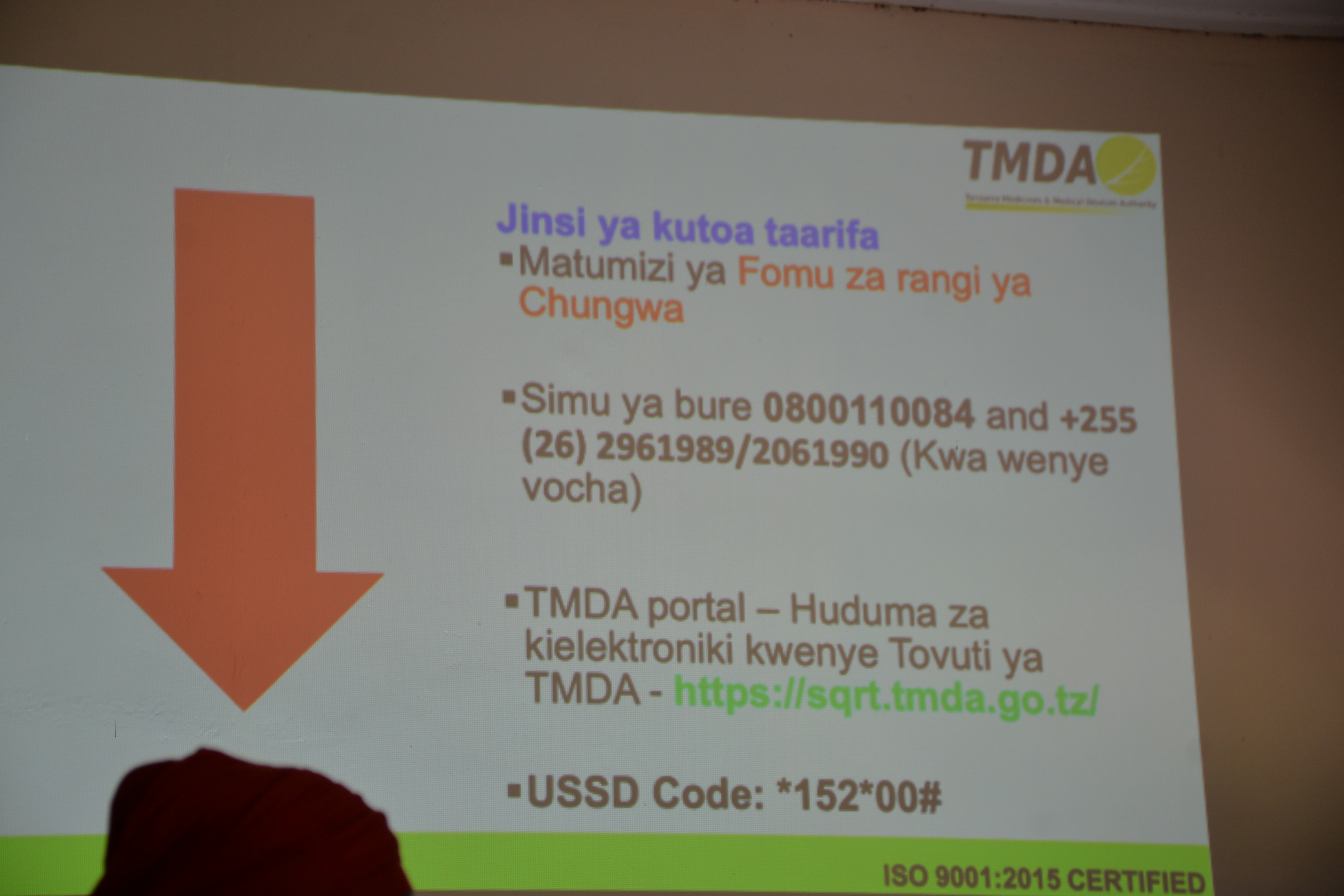 Naye, Mkaguzi wa Dawa na Vifaa Tiba kutoka ofisi ya TMDA, Kanda ya Ziwa Mashariki - Mwanza, Ndg. Kapilya Haruni aliwafundisha njia mbalimbali za utoaji taarifa zikiwemo fomu maalum ya rangi ya chungwa ambayo inatumika na namna ya kuzijaza fomu hizo.